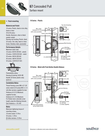 598www.southco.com/67 Dimensions in millimeters (inch) unless otherwise statedACTUAL SIZE40 SeriesACTUAL SIZE20 SeriesACTUAL SIZE10 Series31(1.22) 2.5 (.09)20.5(.81)81(3.19)Pull34(1.34)28.5(1.12)Self tapping screws 16 (.63) long(2 screws supplied)Max. panel thickness 6.4 (.25)(with screws provided)20.5 (.81)14.3 (.56)17.1 (.67)14.3(.56)Panel or door Ø 7.2(.28)Bushings(2 supplied)Top view of bushing21(.83)106(4.17)14.3 (.56)41.5 (1.63)43.5 (1.72)2.5(.09)29.5(1.16)20.5(.81)14.3 (.56)17.1 (.67)PullSelf tapping screws 16 (.63) long(2 screws supplied)Max. panel thickness6.4 (.25) (with screws provided)Black housingBlack housingØ 7.2(.28)Bushings(2 supplied)Top view of bushing10 Series - Metal with Push Button Handle Release 31(1.22)2.5 (.09)20.5(.81)81(3.19)Pull34(1.34)28.5(1.12)Self tapping screws 16 (.63) long(2 screws supplied)Max. panel thickness 6.4 (.25)(with screws provided)20.5 (.81)14.3 (.56)17.1 (.67)14.3(.56)Panel or door Ø 7.2(.28)Bushings(2 supplied)Top view of bushingPullBlack housingMax. panel thickness 6.4 (.25)(with screws provided)21.1(.83) 2.5 (.09) 14.3(.56)11.5(.45)83.1(3.27)Self tapping screws 16 (.63) long(2 screws supplied)20.5 (.81)14.3 (.56)17.1 (.67)Bushings(2 supplied)Top view of bushingHousingØ 7.2(.28) Panel or door32(1.27)26(1.03)Push button releasesspring-loaded handleACTUAL SIZE10 Series67 Concealed PullSurface mount• Flush mountingMaterial and Finish10 series: Plastic, black or zinc alloy, black or silver20 & 40 series: Handle: Aluminum, silver or black powder coatedHousing and bushing: Plastic, black50 series: Zinc alloy, black or silverScre Stainless steel, passivatedPerformance DetailsMaximum static load:10 series: 620 N (140 lbf) - plastic10 series: 1100 N (250 lbf) - metal20 series: 440 N (100 lbf)40 series: 580 N (130 lbf)50 series: 1220 N (272 lbf)Flammability rating:Housing & bushing: UL94-HBHandle (10 Series plastic only): UL94-V2Installation NotesThread forming screw (M4 x 0.7 (10 series metal & 50 series) M4.2 x 1.4 (all other versions supplied for door thickness 6.4 (2.5) Maximun)supplied for door thickness 6.4 (.25) Maximum. For thicker doors calculate screw length using the following formula: Door thickness + 10 (.40)NotesMaximum tightening torque of mounting screws: 10 series metal: 2.5 N.m50 series: 1.5 N.mAll other versions: 2.5 N.m 10 Series - Plastic