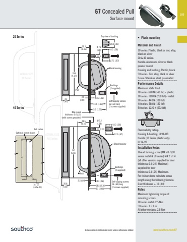 599Dimensions in millimeters (inch) unless otherwise stated www.southco.com/67ACTUAL SIZE40 SeriesACTUAL SIZE20 SeriesACTUAL SIZE10 SeriesACTUAL SIZE40 SeriesACTUAL SIZE20 SeriesACTUAL SIZE10 Series14.3 (.56)58.5 (2.30)61 (2.40)2.5 (.09)20.8(.82)141(5.55)Pull29.5(1.16) 14.3 (.56)17.1 (.67)Ø 7.2(.28)Max. panelthickness 6.4 (.25)(with screws provided)Black housingBushings(2 supplied)Self tapping screws 16 (.63) long(2 screws supplied)21(.83)106(4.17)14.3 (.56)41.5 (1.63)43.5 (1.72)2.5(.09)29.5(1.16)20.5 (.81)14.3 (.56)17.1 (.67)PullSelf tapping screws 16 (.63) long(2 screws supplied)Black housingØ 7.2(.28)Bushings(2 supplied)Top view of bushingFull radiusAOptional corner shape16(.62±.01) +0.0-0.540 Series67 Concealed PullSurface mount• Flush mountingMaterial and Finish10 series: Plastic, black or zinc alloy, black or silver20 & 40 series: Handle: Aluminum, silver or black powder coatedHousing and bushing: Plastic, black50 series: Zinc alloy, black or silverScre Stainless steel, passivatedPerformance DetailsMaximum static load:10 series: 620 N (140 lbf) - plastic10 series: 1100 N (250 lbf) - metal20 series: 440 N (100 lbf)40 series: 580 N (130 lbf)50 series: 1220 N (272 lbf)Flammability rating:Housing & bushing: UL94-HBHandle (10 Series plastic only): UL94-V2Installation NotesThread forming screw (M4 x 0.7 (10 series metal & 50 series) M4.2 x 1.4 (all other versions supplied for door thickness 6.4 (2.5) Maximun)supplied for door thickness 6.4 (.25) Maximum. For thicker doors calculate screw length using the following formula: Door thickness + 10 (.40)NotesMaximum tightening torque of mounting screws: 10 series metal: 2.5 N.m50 series: 1.5 N.mAll other versions: 2.5 N.m 20 Series