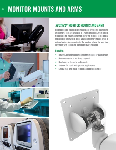 56SOUTHCO® MONITOR MOUNTS AND ARMSSouthco Monitor Mounts allow intuitive and ergonomic positioning of monitors. They are available in a range of options, from simple tilt devices to mount arms that allow the monitor to be easily manipulated in multiple axes. Southco Monitor Mounts offer a unique feature by remaining in the position where the user has left them, with no locking clamps or levers required.Benefits:• Intuitive, ergonomic positioning of the monitor or touchscreen• No maintenance or servicing required• No clamps or levers to lock/unlock• Suitable for static and dynamic applications• Simply grab and move, release and position is heldMONITOR MOUNTS AND ARMS