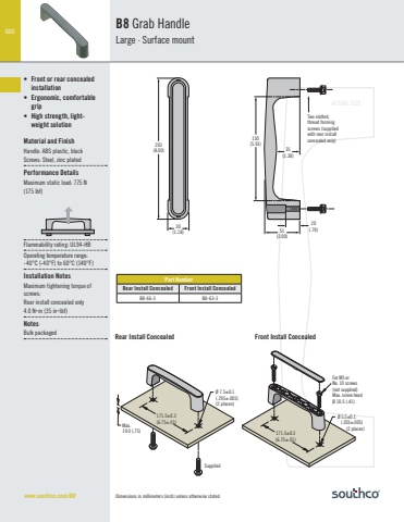 600Dimensions in millimeters (inch) unless otherwise statedACTUAL SIZE51(2.00)20(.79)203(8.00)30(1.18)150(5.91)35(1.38)Two slotted, thread formingscrews (suppliedwith rear install concealed only)171.5±0.3(6.75±.01)Ø 5.5±0.1 (.203±.005) (2 places) Max. 19.0 (.75)SuppliedFront Mount171.5±0.3(6.75±.01)For M5 or No. 10 screws(not supplied)Max. screw head Ø 10.5 (.41)Ø 7.5±0.1(.295±.005)(2 places)• Front or rear concealed installation• Ergonomic, comfortable grip• High strength, lightweight solutionMaterial and FinishHandle: ABS plastic, blackScrews: Steel, zinc platedPerformance DetailsMaximum static load: 775 N (175 lbf)Flammability rating: UL94-HBOperating temperature range:-40°C (-40°F) to 60°C (140°F)Installation NotesMaximum tightening torque of screws:Rear install concealed only 4.0 Nm (35 inlbf)NotesBulk packagedwww.southco.com/B8B8 Grab HandleLarge · Surface mountPart NumberRear Install Concealed Front Install ConcealedB8-66-3 B8-63-3Rear Install Concealed Front Install Concealed