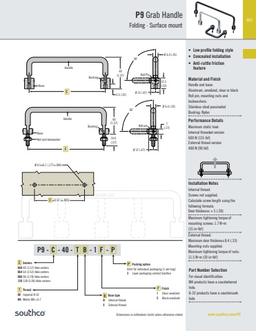 603Dimensions in millimeters (inch) unless otherwise statedACTUAL SIZE40(1.57)13.3(.52)Ø 12 (.47)Roll PinBushing5.5 (.22)BaseHandle90˚Ø 6.4 (.25)C40(1.57)90˚7(.27)Ø 12 (.47)14.6(.57)Ø 6.4 (.25)CBaseHandleNut and lockwasherBushing Roll pin±0.12 (±.005)Ø 4.5±0.1 (.177±.004)CP9 Grab HandleFolding · Surface mountwww.southco.com/P9• Low profile folding style• Concealed installation• Anti-rattle friction featureMaterial and FinishHandle and base: Aluminum, anodized, clear or blackRoll pin, mounting nuts and lockwashers: Stainless steel passivatedBushing: NylonPerformance DetailsMaximum static load:Internal threaded version600 N (135 lbf)External thread version400 N (90 lbf)Installation NotesInternal thread: Screws not supplied.Calculate screw length using the following formula: Door thickness + 5 (.20)Maximum tightening torque of mounting screws: 1.7 Nm (15 inlbf)External thread:Maximum door thickness 8.4 (.33) Mounting nuts supplied. Maximum tightening torque of nuts: 11.5 Nm (10 inlbf) P9 - C - 40 - T B - 1 F - PP Packing optionOmit for individual packaging (1 per bag)3 Layer packaging contact SouthcoF Finish1 Clear anodized5 Black anodized B Base typeN Internal threadX External threadC Centers040 40 (1.57) Hole centers064 64 (2.52) Hole centers096 96 (3.78) Hole centers128 128 (5.04) Hole centersT Thread08 Imperial 8-32M4 Metric M4 x 0.7Part Number SelectionFor visual identification: M4 products have a counterbored hole.8-32 products have a countersunk hole