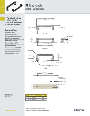 603ADimensions in millimeters (inch) unless otherwise statedPart Number ColorP9-064-28-000-31 BlackP9-064-28-00F-31 BlueP9 Grab HandleFolding • Surface mount• Plastic handle with color options available• Low profile folding handle• Concealed InstallationMaterial and FinishHandle and Sleeve: Glass reinforced nylonPin: Stanless Steel, passivatedBase: Zinc, chromate platedPerformance DetailsMax. working load : 270 NInstallation NotesInstall assembly with M5 X 0.8 screws (screws not supplied)Maximun tightening torque of mounting screws : 2.2 NmPart NumberSee tableFor other color options, please contact Southco74.4 (2.93)72 (2.84)2x 18.9 (.75)R4 4(.16)2x Ø10 (.40)2x Ø7.5 (0.29)64 ±0.1(2.51 ±.003) 2x Ø7.6(.29) +0.102x 6.9(.27) +0.101.6 (.06)A A2x M5 x 0.8(.03) 6(.23) 2x 1.4(.05)64 (2.52)17(.67)27.9 (1.09)10.6 (.42)64 (2.52)2x Ø10.4(.40)ReleasedPulledPanel ThicknessSpringSleeveBaseMin. ThreadHandlewww.southco.com/P9