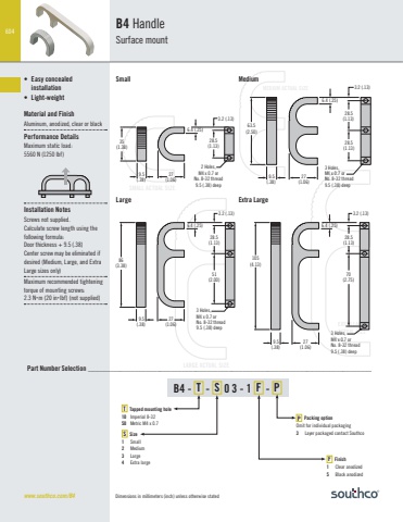 604Dimensions in millimeters (inch) unless otherwise statedEXTRA LARGE ACTUAL SIZEMEDIUM ACTUAL SIZESMALL ACTUAL SIZELARGE ACTUAL SIZE27(1.06)9.5(.38) 63.5(2.50)6.4 (.25)28.5(1.13) 3.2 (.13) 28.5(1.13)3 Holes,M4 x 0.7 orNo. 8-32 thread9.5 (.38) deep27(1.06)9.5(.38) 86(3.38)6.4 (.25)28.5(1.13)3 Holes,M4 x 0.7 or No. 8-32 thread9.5 (.38) deep3 Holes,M4 x 0.7 or No. 8-32 thread9.5 (.38) deep51(2.00)3.2 (.13) 27(1.06)9.5(.38) 105(4.13)6.4 (.25)28.5(1.13)70(2.75)3.2 (.13) 27(1.06)9.5(.38) 35(1.38)6.4 (.25)28.5(1.13)3.2 (.13) 2 Holes,M4 x 0.7 orNo. 8-32 thread9.5 (.38) deepB4 HandleSurface mountMediumExtra LargeB4 - T - S 0 3 - 1 F - PPart Number Selection _______________________________________________________________________________P Packing optionOmit for individual packaging3 Layer packaged contact SouthcoF Finish1 Clear anodized5 Black anodized• Easy concealed installation• Light-weightMaterial and FinishAluminum, anodized, clear or blackPerformance DetailsMaximum static load:5560 N (1250 lbf)Installation NotesScrews not supplied.Calculate screw length using the following formula: Door thickness + 9.5 (.38)Center screw may be eliminated if desired (Medium, Large, and Extra Large sizes only)Maximum recommended tightening torque of mounting screws:2.3 Nm (20 inlbf) (not supplied)S Size1 Small2 Medium3 Large4 Extra largeT Tapped mounting hole10 Imperial 8-3250 Metric M4 x 0.7www.southco.com/B4SmallLarge