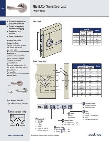 606MA - BB - D L T - HH - FFMA McCoy Swing Door LatchPrivacy Knob• Marine-grade materials to prevent corrosion• Double springs keep handle from sagging• Emergency lock override• Privacy lock optionMaterial and FinishLock engine: BrassHandles, escutcheons, accents and privacy knob: BrassSee Finish TableAppearance:Combine handles, escutcheon plates, and accent plates to customize the latch for your application.For unique styling combine the McCoy with a wide range of stylish Olivari handles. See page 609Handle Types:NovaPortofinoDoor LatchPanel PreparationABCDELeftHand outLeft Hand inRight Hand outRight Hand inFF Finish10 Chrome12 Chrome + Satin Accent20 Satin21 Satin + Chrome Accent D Directional2 Right Out3 Right In4 Left Out5 Left In6 Right Out - Left In7 Left Out - Right InT Door Thickness0 22-30mm (7/8” - 1 3/16”)1 28-37mm (1 1/8” - 1 1/2”)L Locking Option0 Non Locking D = 6 or 72 Privacy D = 2, 3, 4 or 5BB Latch Mechanism01 Standard Springbolt08 Double SpringboltHH Handle01 Nova02 Portofino(For Strikers please see page 614)Imperial MetricNominal DecimalA 3 29/32 3.91 99B 41/64 .64 16C 1 23/32 1.71 43.5D 3 15/16 3.94 100E 2 3/16 2.17 5530ºØ K 2 PlacesØ G 2 PlacesØ AØ DC BHJEFLIPart Number Selection _______________________________________________________________________________D Directional Door Swing:Imperial MetricNominal DecimalA 5/8 .64 8.2B 3 29/32 3.91 99C 2 31/64 2.48 63D 1/2 .50 13E 2 15/32 2.46 62.5F 5/64 .08 2G 5/8 .63 16H 1 25/32 1.77 45I 1/2 .50 12.5J 1 3/32 1.09 27.7K 1/4 .25 6.5www.southco.com/MA Dimensions in millimeters (inch) unless otherwise stated