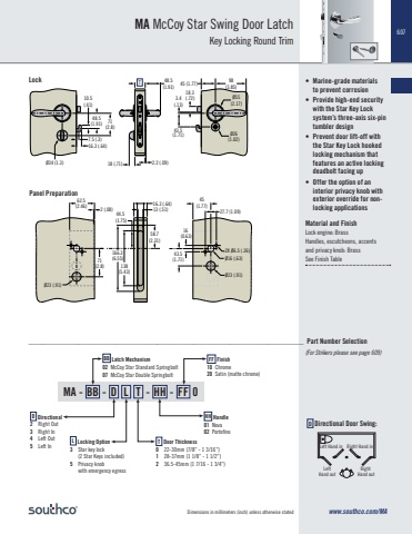 607MA - BB - D L T - HH - FF 0MA McCoy Star Swing Door LatchKey Locking Round Trim• Marine-grade materials to prevent corrosion• Provide high-end security with the Star Key Lock system’s three-axis six-pin tumbler design• Prevent door lift-off with the Star Key Lock hooked locking mechanism that features an active locking deadbolt facing up• Offer the option of an interior privacy knob with exterior override for nonlocking applicationsMaterial and FinishLock engine: BrassHandles, escutcheons, accents and privacy knob: BrassSee Finish Table10.5(.41)71(2.8)48.5(1.91)3.4(.13)45 (1.77) 98(3.85)43.5(1.71)18.3(.72)Ø26(1.02)Ø55(2.17)48.5(1.91)Ø34 (1.3)16.3 (.64)18 (.71) 2.2 (.09)7.5 (.3)Inside escutcheonLatch moduleLock moduleWasher Drive barHandleAccentSet screw #10 Keyway assemblyOutside escutcheonInterior privacy knob assemblyT Lock___________________________________________________________________________ Part Number SelectionFF Finish10 Chrome20 Satin (matte chrome)D Directional2 Right Out3 Right In4 Left Out5 Left InT Door Thickness0 22-30mm (7/8” - 1 3/16”)1 28-37mm (1 1/8” - 1 1/2”)2 36.5-45mm (1 7/16 - 1 3/4”)L Locking Option3 Star key lock (2 Star Keys included)5 Privacy knob with emergency egressBB Latch Mechanism02 McCoy Star Standard Springbolt07 McCoy Star Double SpringboltHH Handle01 Nova02 PortofinoLeftHand outLeft Hand inRight Hand outRight Hand inPanel Preparation62.5(2.46)Ø23 (.91)2 (.08)71(2.8)166.3 (6.55)138(5.43)16.3 (.64)13 (.51)58.7(2.31)43.5(1.71)16 (0.63)45(1.77)27.7 (1.09)2X Ø6.5 (.26) Ø16 (.63)Ø23 (.91)44.5 (1.75)D Directional Door Swing:www.southco.com/MA(For Strikers please see page 609)Dimensions in millimeters (inch) unless otherwise stated