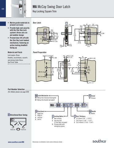 608MA - BB - D L T - HH - FF 1MA McCoy Swing Door LatchKey Locking Square Trim10.5(.41)71(2.8)45.1(1.77)3.4(.13)45(1.77)115(4.53)43.5(1.71)40(1.6)18.3(.72)48.5(1.91)16.2 (.64)19.6(.8)25 (1)3.6(.14)7.5 (.3)143(5.6)27.5 (1.08)T62.5 (2.46)Ø10 (.4)2 (.08)71(2.8)166.3 (6.55)138(5.43)16.3 (.64)13 (.51)58.7 (2.31) 44.5(1.75)43.5(1.71)44(1.73)45(1.77)28.5(1.12)Ø16.5 (.65)Ø20 (.8)59.5(2.34) Ø8 3X (.3)Panel PreparationDoor LatchLeftHand outLeft Hand inRight Hand outRight Hand inFF Finish10 ChromeD Directional2 Right Out3 Right In4 Left Out5 Left InT Door Thickness0 22-30mm (7/8” - 1 3/16”)1 28-37mm (1 1/8” - 1 1/2”)2 36.5-45mm (1 7/16 - 1 3/4”)L Locking Option0 Non-Locking3 Star key lock(2 Star Keys included)5 Privacy knob with emergency egressBB Latch Mechanism02 McCoy Star Standard Springbolt07 McCoy Star Double SpringboltHH Handle42 NordicPart Number Selection _______________________________________________________________________________D Directional Door Swing:• Marine grade materials to prevent corrosion• Provide high-end security with the Star Key Lock system’s three-axis sixpin tumbler design• Prevent door lift-off with the Star Key Lock hooked mechanism, featuring an active locking deadbolt facing upMaterial and FinishLock engine: BrassHandles, escutcheons, accents and privacy knob: BrassSee Finish Table(For Strikers please see page 609)www.southco.com/MA Dimensions in millimeters (inch) unless otherwise stated