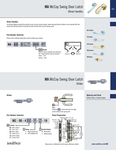 609Dimensions in millimeters (inch) unless otherwise statedMA - BB - D L T - HHH - FFMC - 90 - 4 XX - Y - Z - 10MA McCoy Swing Door LatchStrikerMA McCoy Swing Door LatchOlivari handles167 Emilia174 Aster134 Torino186 Sector108 UovoHHH HandleRefer to Olivari website and literature for 3-digit handle code for exampleAster = 174Sector = 186Part Number SelectionPart Number SelectionLeftHand outLeft Hand inRight Hand outRight Hand inStrikerY Swing Z1 Right In/Left Out2 Left In/Right OutDustbin Option0 No Dustbin1 With DustbinXX Position05 5mm (3/16”)07 7mm (1/4”)09 9mm (3/8”)13 13mm (1/2”)16 16mm (5/8”)21 21mm (7/8”)XX See note Note:Distance XX is measured from the edge of the frame to the spring boltMaterial and FinishStriker: Brass, chrome platedOlivari HandlesLet Southco Marine provide the perfect accent to your interior design. Award winning Olivari handles can be teamed with the world class McCoy lockset to provide the look and feel that set your design apart. Please refer to McCoy Swing Door Latch for Base part number.Panel Preparation19.5 (.8)13 (.51)13.4 (.53)30.9(1.22)73.8(2.91)47 (1.85)12.4 (.5)134.4(5.29)34.4(1.35)2.75 (.11)2 (.08)if not usingdustbinCentrelineofstrikertongueA-A AA18.3 (.7)14.5 (.57)Distance (XX) - 4.2 (.17)www.southco.com/MA