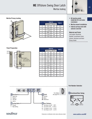 611ME - 02 - D L T - FFD Directional2 Right Out3 Right In4 Left Out5 Left InT Door Thickness4 18-22mm (11/16” - 7/8”)5 22-27mm (7/8” - 1 1/16”)6 27-32mm (1 1/6” - 1 1/4”)7 32-37mm (1 1/4” - 1 1/2”)L Locking Option0 Privacy1 Key LockingFF Finish10 Chrome50 Black60 AluminumLeftHand outLeft Hand inRight Hand outRight Hand inMortise Privacy LockingPanel PreparationABCDEFØ HØ IØ KØ LØ J depth = 3 (1/8”) only on privacy knob sideØ BØ AC DEGFME Offshore Swing Door LatchMortise lockingD Directional Door Swing: _______________________________________________________________________ Part Number SelectionImperial MetricNominal DecimalA 31/64 .492 12.5B 5 5/16 5.31 135C 3 15/16 3.94 100D 39/64 .61 15.5E 4 37/64 4.59 116F 1 3/16 1.18 30Imperial MetricNominal DecimalA 1/2 .50 12.5B 1/2 .50 12.5C 5 5/16 5.31 135D 4 4 102E 1/16 .06 1.5F 1 11/16 1.69 43G 1 11/64 1.17 30H 5/16 .31 8I 1/2 .50 12J 7/8 .88 22K 1/2 .50 12L 5/16 .31 8www.southco.com/ME• All marine-grade materials for corrosion resistance• Mortise mount installation• Interior privacy lock with exterior overrideMaterial and FinishLock engine: AluminumHandles, escutcheons finish: chrome, aluminum and blackPrivacy: AcetalFor strikers see page 614 Dimensions in millimeters (inch) unless otherwise stated