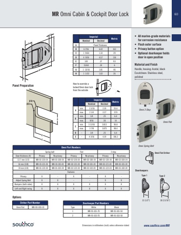MR 613 Omni Cabin & Cockpit Door Lockwww.southco.com/MRCEBFGHDAHow to override a locked door from the outsideM/S CompactM/S Offshore flush mounted M/S Offshore mortise mountedM/S OffshoreM/S McCoy M/S OmniM/S TalonM/S Talon without keylockingHow to override a locked Omni door lock from the outsideOmni 2-StepOmni FlatOmni Spring Bolt Omni Part NumbersSpring bolt Flat 2 stepDoor thickness (A) Privacy No privacy Privacy No privacy Privacy No privacy12.7 mm (1/2) MR-01-120-24 MR-01-100-24 MR-02-120-24 MR-02-100-24 MR-03-120-24 MR-03-100-2416 mm (5/8) MR-01-121-24 MR-01-101-24 MR-02-121-24 MR-02-101-24 MR-03-121-24 MR-03-101-2419 mm (3/4) MR-01-122-24 MR-01-102-24 MR-02-122-24 MR-02-102-24 MR-03-122-24 MR-03-102-24FeaturesPrivacy X - X - X -Adjust Spring Bolt X X - - X XBumpers (both sides) X X X X X XLeft and Right swing X X X X X X• All marine-grade materials for corrosion resistance• Flush outer surface• Privacy button option• Optional doorkeeper holds door in open positionMaterial and FinishHandle, housing: Acetal, blackEscutcheon: Stainless steel, polishedImperial MetricNominal DecimalA Panel ThicknessB 6 7/16 6.42 163C 1 9/64 1.14 29D 4 9/16 4.57 116E 3/8 .37 9.5F 15/64 .24 6G 1 13/16 1.81 46H 1 1/32 1.02 26Imperial MetricNominal DecimalAmin. 2 3/16 2.19 55.6max. 2 1/4 2.27 57.9Bmin. 1/4 .25 6.4max. 9/16 .56 14Cmin. 3 13/16 3.813 96.8max. 3 7/8 3.875 98.4D - 1/4 .25 6.4E - 4 3/16 4.19 106.3Panel PreparationECAØ DØ BOptions Doorkeeper Part NumbersType White Black1 MR-91-101-70 MR-91-101-502 MR-91-102-70 MR-91-102-50Striker Part NumberOmni Flat MR-90-100-10Type 1 Type 2 DOORKEEPER PART NUMBERSWhite Black 1 2MR-91-101-70MR-91-102-70MR-91-101-50MR-91-102-5012 (1/2\18 (11/16\TypeOMNI flat MR-90-100-10STRIKER PART NUMBERType 1 Type 2 DOORKEEPER PART NUMBERSWhite Black 1 2MR-91-101-70MR-91-102-70MR-91-101-50MR-91-102-5012 (1/2\18 (11/16\TypeOmni Flat StrikerType 1 Type 2DoorkeepersDimensions in millimeters (inch) unless otherwise stated