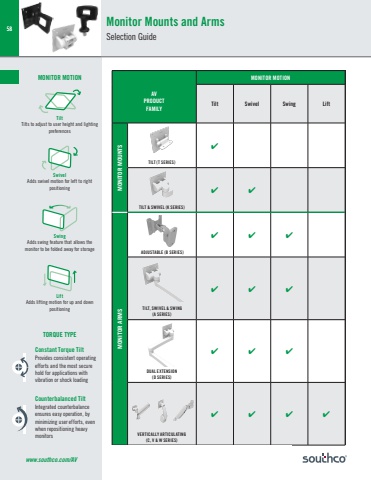 Dimensions in millimeters (inch) unless otherwise statedAVPRODUCTFAMILYMONITOR MOTIONTilt Swivel Swing LiftMONITOR MOUNTSTILT (T SERIES)✔TILT & SWIVEL (K SERIES)✔ ✔MONITOR ARMS ADJUSTABLE (B SERIES)✔ ✔ ✔ TILT, SWIVEL & SWING (A SERIES)✔ ✔ ✔DUAL EXTENSION (D SERIES)✔ ✔ ✔VERTICALLY ARTICULATING(C, V & W SERIES)✔ ✔ ✔ ✔58www.southco.com/AVMonitor Mounts and ArmsSelection GuideMONITOR MOTIONTiltTilts to adjust to user height and lighting preferencesSwivelAdds swivel motion for left to right positioningSwingAdds swing feature that allows the monitor to be folded away for storageLiftAdds lifting motion for up and down positioningTORQUE TYPEConstant Torque TiltProvides consistent operating efforts and the most secure hold for applications with vibration or shock loading Counterbalanced TiltIntegrated counterbalance ensures easy operation, by minimizing user efforts, even when repositioning heavy monitors