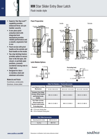 616• Superior Star Key LockTMcapability provides enhanced three-axis pin tumbler security• A one-piece pivot actuation latch with integrated lock mechanism provides reliable performance and a smooth, ergonomic feel in use• Flush version with pivot handle on the outside and flush handle on the inside• Top-stop latching feature provides option to secure door in the full open, full closed, or partially open positions, prevents accidental closing even in rough seas• Designed for doors in stainless steel and aluminum extrusionsMaterial and FinishEscutcheons, outside plate: Aluminum, chrome platedMM Star Slider Entry Door LatchFlush inside styleStar Slider AccessoriesMounting tool for striker MM-90-103-41Top Stop MM-7520Slider Part Numbers - Flush inside versionLatch Module Locking MechanismDoor Thickness (A)23 (.9) - 28.5 (1.12) 28.5 (1.12) - 33.5 (1.32) 33.5 (1.32) - 38 (1.50)Standard. Star Slider chrome. Offset handle and flushed inside handle.MM-03-131-XX-10 MM-03-132-XX-10 MM-03-133-XX-10Star Slider chrome. Offset handle and flushed inside handle. Protruding hook.MM-03-331-XX-10 MM-03-332-XX-10 MM-03-333-XX-1030.6(1.2)3(0.12)R4.3 (4X)(0.17)R4 (0.2)R4 (4X)(0.16)101 (3.98)180.5 (7.1)21 (1.1)40.5(2)21(0.8)MAX R7.5(0.3)Ø8 (0.32)Ø27 (1.06)Ø8 (0.32)69 (3)35 (1.4)SEE DRAWJ-MM-03-3FOR MATCHBOXCUT OUTS126(5)130(5.1) 4(0.2)30(1.18)A BM4 (2X)31 (1.2)121(4.8)168.5(6.6)41 (1.6)59 (2.3)99 (4)49 (2)Ø 19(Ø0.75)Panel PreparationLatch Module OptionsInside OutsideLatch Module Options10.5(.41)5 (.21)46 (1.81)17 (.67)28 (1.1)6 (.24) 11 (.43)R1.5 (.06) 4XStandardProtruding hook10.5(.41)5 (.21)46 (1.81)17 (.67)28 (1.1)6 (.24) 11 (.43)R1.5 (.06) 4XProtruding hookwww.southco.com/MMXX = 15 for port closing doorXX = 16 for starboard closing doorDimensions in millimeters (inch) unless otherwise stated