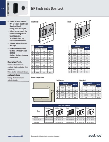 618 MF Flush Entry Door LockFlush Oval FlushDHCJ EIGGCDBHJAFBDHCJ EIGGCDBHJAFB• Allows for 100 - 150mm (4”- 6”) more door travel than traditional sliding-door lock styles• Safety lock prevents the door from being locked from the inside. To activate: turn key clockwise and remove• Shipped with striker and two keys• Locks can be matched to other SOUTHCO® deck latches.Contact Southco for more informationMaterial and Finish:Stainless Steel, Aluminum anodized, Black anodized or White powdercoat.Shape: Oval or rectangular design.Available Options:Sealing: Weatherproof and watertight seals.AØ BCDØ EPanel PreparationFlush Square Flush OvalImperial MetricNominal DecimalA 1/2 .50 12.7B 3 7/8 3.88 98.5C 49/64 .77 19.5D 49/64 .77 19.6E 3 3/4 3.74 95F 5 53/64 5.83 148G 53/64 .83 21H 33/64 .51 13I 13/64 .2 5J 1 3/4 1.75 44.5Flush Part NumbersStyleAluminum Stainless steel Black White OvalStandard MF-01-110-60 MF-01-110-24 MF-01-110-50 MF-01-110-70 MF-01-310-24Weather Proof MF-02-110-60 MF-02-110-24 MF-02-110-50 MF-02-110-70 MF-02-310-24Watertight MF-03-110-60 MF-03-110-24 MF-03-110-50 MF-03-110-70 MF-03-310-24Imperial MetricNominal DecimalA 1/2 .50 12.7B 1 1/8 1.12 28.5C 25/32 .77 20D 3 49/64 3.76 95.5E 53/64 .83 21F 2 7/8 2.88 73G 5 9/32 5.28 134H 21/64 .34 8.5I 15/64 .24 6J 1 3/4 1.75 44.5Imperial MetricNominal DecimalA 2 1/2 2.5 63.5B 5/8 .63 16C 4 1/2 4.5 114D 4 61/64 4.95 125.7E 1/4 .25 6.4Imperial MetricNominal DecimalA 2 1/2 2.5 63.5B 5/8 .63 16C 4 1/2 4.5 114D 5 5/16 5.31 135E 1/4 .25 6.35www.southco.com/MF Dimensions in millimeters (inch) unless otherwise stated