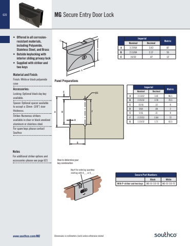 620 MG Secure Entry Door Lock• Offered in all corrosionresistant materials, including Polyamide, Stainless Steel, and Brass• Outside keylocking with interior sliding privacy lock• Supplied with striker and two keysMaterial and Finish:Finish: White or black polyamide caseAccessories:Locking: Optional black day key available.Spacer: Optional spacer available to accept a 10mm (3/8”) door thickness.Striker: Numerous strikers available in clear or black anodized aluminum or stainless steel.For spare keys please contact SouthcoPanel PreparationsØ EA BCDFGTo open:Turn counter clockwise 1/6Insert key horizontallyTo lock:To open:Turn counter clokwise 1/6Insert key horizontallyTo lock:Save this instructioncard and spare key# for future reference.Save this instructioncard and spare key# for future reference.Key # for ordering sparekeyKey # for ordering sparekey starting with 8_ _ or 9_ _starting with 8_ _ or 9_ _Flush - Oval M/S Flush OvalM/S Offshore flush mounted M/S Offshore mortise mountedKey # for ordering sparekeystarting with 8_ _ or 9_ _For spare keys pleasecontact Southco Within US: info@southco.com Outside US: mobella@southco.com How to determine your key combinationM/S OffshoreM/S Flush M/S SecureM/S TalonHow to determine your key combinationCBASecure Part NumbersBlack WhiteWith P-striker and two keys MG-01-110-50 MG-01-110-70Imperial MetricNominal DecimalA 3 27/64 3.43 87B 2 11/64 2.17 55C 15/32 .47 12Imperial MetricNominal DecimalA 3 13/32 3.41 86.5B 2 25/32 2.78 70.5C 15/16 .32 8D 5/64 .08 2E 5/16 .31 8F 2 27/32 2.84 72G 1 23/32 1.71 43.5www.southco.com/MGNotesFor additional striker options and accessories please see page 621Dimensions in millimeters (inch) unless otherwise stated
