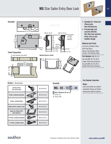 621ACTUAL SIZEDay key, black(for secure only) MF-96-XXX-41Striker, anodized aluminum MG-90-102-60Striker, anodized black MG-90-102-50Eyelet striker, stainless steel MG-90-103-24Spacer for 10mm (3/8”) door thickness MG-92-100-50P-striker, anodized aluminum(anodized aluminum) (anodized black)MG-90-105-50P-striker, anodized, black(anodized aluminum) (anodized black)MG-90-105-61MG Star Sailor Entry Door Lock• Suitable for 12mm and 22mm entry door thicknesses • Provide high-end security with the Star Key Lock system´s three-axis six-pin tumbler designMaterial and FinishLock Case: Stainless Steel Star Plug: BrassSpring: 316 Stainless SteelScrews: 316 Stainless SteelPart Number: MG-05-115Use with MG-05-733-24 to enable 10mm Door thicknessUse with MG-05-736-24 to enable 20mm Door thickness95 (3.74) 76 (2.99)15.5(.61)55.9(2.2)R12.5(.49)M4 Screw x 2PanelLock moduleFemale Screw x 230.5(1.20)MG-05-736-24 Stamped key combination MG-05-733-241mm gasketto enable1.2” doorthicknessOptionalspacer22.2 (.87) 12 (.47) 17.6 (.70) 25.2 (.99)57.4(2.26)14(.55)Assembly95.584701.5A. Door thickness (see table)R45345Panel Preparation94.8 (3.73) 2(.08)55.4(2.18)Optional Spacer (2mm)C Door Thickness (A)3 12mm (.5)6 22mm (.86)MG - 05 - 73 C - 24Strikers - Accessories Assemblywww.southco.com/MG___________________________________________________________________________ Part Number SelectionNotesLatch and striker are ordered separately. Please see Striker - Accessories table for optionsDimensions in millimeters (inch) unless otherwise stated