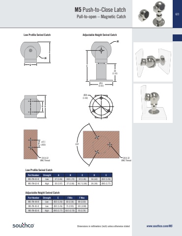 Dimensions in millimeters (inch) unless otherwise stated623www.southco.com/M5Low Profile Swivel Catch Adjustable Height Swivel CatchPart Number Strength A B C D EM5-7N-43-8 Low 37 (1.46) 18.5 (.73) 32 (1.26) 16 (.63) Ø32 (1.26)M5-7N-63-8 High 50 (1.97) 27 (1.06) 46.7 (1.84) 24 (.94) Ø45 (1.77)Low Profile Swivel CatchPart Number Strength E F Min F MaxM5-7N-44-8 Low Ø32 (1.26) 60 (2.36) 89 (3.50)M5-7N-45-8 Low Ø32 (1.26) 75 (2.95) 101 (3.98)M5-7N-65-8 High Ø45 (1.77) 68.5 (2.70) 95 (3.74)Adjustable Height Swivel Catch3X 8-32UNC Thread2X 8-32UNC ThreadM5 Push-to-Close Latch Pull-to-open – Magnetic CatchD ADØECØEB39(1.53)FØ51(2.01)Ø38(1.50)120˚ ±0.1(.003)