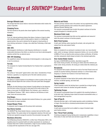 626Glossary of SOUTHCO® Standard TermsAverage Ultimate Load:The average load that causes failure or excessive deformation which renders the product inoperable.Clamping Force:The force exerted on the panels when drawn together at the nominal mounting dimensions.Detent:A pre-set, internal positioning feature that allows a fastener or hinge to rotate into fractional positions and/or to hold panel(s) or door(s) in a full/partially opened position. Also used to indicate the full-opened or closed position of some latching mechanisms. In hinges, also called Door Positioning or Hold-open feature.EMI / RFI:Electromagnetic interference or radio frequency interference is a (usually undesirable) disturbance that affects an electrical circuit due to electromagnetic radiation emitted from an external source.EMI / RFI Shielding: The capability to reduce the transmission of electromagnetic or radio energy into or out of an enclosureFerrule:The component of a Captive Fastener/Quarter-Turn Fastener that is captivated to the panel.Frame:The surface or \thickness / geometry is an important part of the latch selection process.Fully-Retractable:The ability of a Captive Fastener to be withdrawn so that no portion of the screw threads protrude beyond the inner surface of the outer panel when disengaged.Grip: Generally, the total thickness being fastened. Usually defined as the dimension from the outer surface of the door or outer panel to the inside surface of the frame or inner panel. For DZUS® Quarter Turn Fasteners, grip is denoted as \panel, frame and accessory items.Grip Range:The Minimum to Maximum allowable total material thickness for a given product that provides for proper operation. Keeper/Keeper Plate:A component used to engage with the primary latch mechanism.Key-Choice System:The SOUTHCO® Key-Choice System features a common lock core that fits a wide range of latches. This system allows for the independent selection of the latch and the lock core required to manage the security of the end product (see page 158).Machinery Directive:The EU Machinery Directive 2006/42/EC, in effect from 29 December 2009, is the regulatory basis for essential health and safety requirements for machinery at European Union level. Southco recommends a range of access hardware solutions to comply with the requirements of this law. (see page 544).Material and Finish:The base (primary) material used in the product and any supplementary coating applied to provide protection and to enhance the product appearance.Maximum Dynamic Working Load:The maximum recommended load at which the product continues to function properly throughout its intended cycle life. Maximum Static Load:The maximum recommended load after one time application and removal of which the product continues to function properly. Multi-Point System:A multi-point latching system requiring the actuator, rods and guide to be ordered from the same product family.NEMA/IP:Refers to standards for an enclosure’s resistance to dust, rain, hose-directed water, and/or ice damage. Individual components (latches, etc.) are not certified to NEMA or IP, but can help the entire enclosure achieve certification. All latches and other components should always be tested in the individual application. Over-Center/Under-Center: Two types of SOUTHCO® draw latches, described on page 324.Over-center: During actuation, the moving pin rotates above the stationary pin.Under-center: During actuation, the moving pin rotates below the stationary pin. Receptacle:The component that accepts a Quarter-turn stud or Fast-lead Thread screw and provides for positive fastening. Receptacle selection is a critical feature when designing in a Quarter-turn Fastener or Fast-lead Thread screw.Secondary Catch:An optional component of draw latches that provides added resistance to vibration, accidental opening, and shock load.Spring Loaded:A latch assembly in which the latching force is provided by an integral spring component which allows for vibration and gasket relaxation.Tightening Torque:The maximum recommended torque to be applied to the mounting hardware or to the latch itself. Tightening torque should not exceed recommended values, or latch damage/failure may occur.Type A/Type B:Generally describes right- or left-handed operation and/or installation of latches or hinges. Also described as clockwise/counterclockwise latch operation.Rod System:A multi-point accessory that can be added to a range of standard singlepoint Southco latches.Two / Three Point Latching:A latching arrangement having latching and or compression capabilities in two or three areas of a door and frame (see overview on page 206-207).