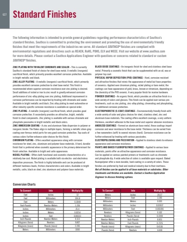 627Standard FinishesConversion ChartsThe following information is intended to provide general guidelines regarding performance characteristics of Southco’s standard finishes. Southco is committed to protecting the environment and promoting the use of environmentally friendly finishes that meet the requirements of the industries we serve. All standard SOUTHCO® finishes are compliant with environmental regulations and directives such as REACH, RoHS, POHS, ELV and WEEE. Visit our website at www.southco.com for more details. Please contact a Southco Applications Engineer with questions or concerns related to standard or custom SOUTHCO® finishes.ZINC PLATING WITH TRIVALENT CHROMATE AND SEALER - This is currently Southco's standard finish of choice for steel base metal. A metallic (inorganic) sacrificial finish, which primarily provides excellent corrosion protection. Available in bright metallic and black. ZINC-ALLOY PLATING - A metallic (inorganic) sacrificial finish, which primarily provides excellent corrosion protection to steel base metal. This finish is recommended where superior corrosion resistance over zinc plating is desired. Small additions of nickel or iron to zinc result in greatly enhanced corrosion performance of zinc-alloy plating over zinc plating. Additional improvement in corrosion performance can be imparted by treating with chromate and sealer. Available in bright metallic and black. Zinc alloy plating to meet automotive or other industry specific corrosion resistance is available on special order. ZINC PLATING - A metallic (inorganic) sacrificial finish, which provides good corrosion protection. It secondarily provides an attractive, bright, metallic finish to steel components. Zinc plating is available with various chromate and phosphate passivates in bright metallic and black colors.ZINC IMMERSION COATING - A zinc and aluminum flake dispersion in polymer or inorganic binder. The flakes align in multiple layers, forming a metallic silver-gray coating over ferrous metal parts for very good corrosion protection. Top coats of various colors further enhance color choices for this finish. CHROMIUM PLATING - Offers excellent appearance along with corrosion resistance for steel, zinc, aluminum and polymer base materials. A hard, durable finish that is preferred when cosmetic appearance is the primary determinant for finish selection. Available in bright and satin appearance. NICKEL PLATING - Offers both functional and cosmetic characteristics at a relatively low cost. Nickel plating is available both via electro- and electroless deposition processes. The finish is highly tailorable and can be produced at different hardness levels, friction characteristics and colors. Available in bright metallic, satin, black on steel, zinc aluminum and polymer base materials.BLACK OXIDE COATINGS - An inorganic finish for steel and stainless steel base metal. Primarily a cosmetic finish that can be supplemented with an oil, wax or polymer top coat. PHYSICAL VAPOR DEPOSITION (PVD) COATINGS - Hard, corrosion resistant and attractive finishes that mimic the appearance of metal but have properties of ceramics. Applied over chromium plating, nickel plating or bare metal, the coatings can have appearance of gold, brass, bronze or chromium, depending on the chemistry of the PVD ceramic. A very popular finish for marine hardware.POWDER COATINGS - An organic finish, which provides an attractive finish in a wide variety of colors and glosses. This finish can be applied over various pretreatments, such as zinc plating, zinc-alloy plating, chromating and phosphating, for additional corrosion protection.ELECTROPHORETIC (E-COAT) COATINGS - Environmentally friendly finish with a wide variety of color and gloss choices for steel, stainless steel, zinc and aluminum base materials. The coating offers excellent coverage, a very uniform thickness, excellent adhesion to the base metal and superior abrasion resistance. ANODIZED COATINGS - Formed on aluminum base metal, these coatings impart corrosion and wear resistance to the base metal. Thickness can be varied from a few nanometers (soft) to several microns (hard). Corrosion resistance can be further enhanced by treating with various passivates. ELECTROPOLISHING AND PASSIVATION - Applied to stainless steels to enhance appearance and corrosion resistance. PAINTS AND BAKED FLUOROPOLYMER COATINGS - Applied to various base materials, paints offer an attractive appearance and corrosion resistance. Can be applied on various painted primers or treatments such as chromate and phosphate dip. A wide selection of colors is available upon request. Baked fluoropolymer offer a more durable, hard coating in a variety of colors. These finishes are preferred by food and medical industry due to their inertness. Not all finishes can be applied to all base materials or substrates. Other treatments and finishes are available. Contact a Southco Application Engineer to discuss finishing options.To Convert Into Multiply ByFeet Inches 12Feet Millimeters 304.8Feet Meters 0.3048Foot-Pounds Newton-Meters 1.356Inches Millimeters 25.4Inches Meters 0.0254Inches Feet 0.08333Inch-Pounds Newton-Meters 0.113Kilograms (force) Newtons 9.807Kilograms (mass) Pounds (mass) 2.205Meters Millimeters 1000To Convert Into Multiply ByMeters Inches 39.37Meters Feet 3.281Millimeters Meters 0.001Millimeters Inches 0.03937Millimeters Feet 0.003281Newtons Kilograms (force) 0.102Newtons Pounds (force) 0.2248Newton-Meters Inch-Pounds 8.851Newton-Meters Foot-Pounds 0.7376Pounds (mass) Kilograms (mass) 0.4536Pounds (force) Newtons 4.448