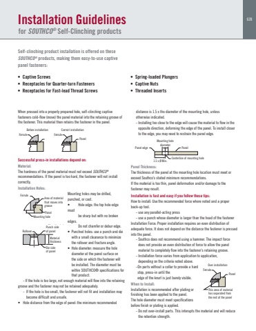 628Installation Guidelinesfor SOUTHCO® Self-Clinching productsSelf-clinching product installation is offered on these SOUTHCO® products, making them easy-to-use captive panel fasteners:When pressed into a properly prepared hole, self-clinching captive fasteners cold-flow (move) the panel material into the retaining groove of the fastener. This material then retains the fastener in the panel. Panel edgeBefore installation Correct installation Over installationMounting holediameterPanel1.5 x Ø Min. Centerline of mounting holeFerrule RolloverFerrule Ferrule FerrulePanelPanelArea of materialthat moves intogrooveMounting holeDie sideof panelMaterialthicknessPunch sideof panelPanelThis area of material has separated from the rest of the panel Successful press-in installations depend on:Material:The hardness of the panel material must not exceed SOUTHCO®recommendations. If the panel is too hard, the fastener will not install correctly.Installation Holes:Mounting holes may be drilled, punched, or cast. • Hole edge: the top hole edgemust be sharp but with no broken edges. Do not chamfer or debur edge.• Punched holes: use a punch and diewith a small clearance to minimize the rollover and fracture angle.• Hole diameter: measure the holediameter at the panel surface on the side on which the fastener will be installed. The diameter must be within SOUTHCO® specifications for that product.- If the hole is too large, not enough material will flow into the retaininggroove and the fastener may not be retained adequately. - If the hole is too small, the fastener will not fit and installation maybecome difficult and unsafe. • Hole distance from the edge of panel: the minimum recommended• Captive Screws • Receptacles for Quarter-turn Fasteners• Receptacles for Fast-lead Thread Screws • Spring-loaded Plungers• Captive Nuts• Threaded Insertsdistance is 1.5 x the diameter of the mounting hole, unless otherwise indicated.- Installing too close to the edge will cause the material to flow in theopposite direction, deforming the edge of the panel. To install closer to the edge, you may need to restrain the panel edge.Panel edgeBefore installation Correct installation Over installationMounting holediameterPanel1.5 x Ø Min. Centerline of mounting holeFerrule RolloverFerrule Ferrule FerrulePanelPanelArea of materialthat moves intogrooveMounting holeDie sideof panelMaterialthicknessPunch sideof panelPanelThis area of material has separated from the rest of the panelPanel Thickness:The thickness of the panel at the mounting hole location must meet or exceed Southco’s stated minimum recommendations. If the material is too thin, panel deformation and/or damage to the fastener may result.Installation is fast and easy if you follow these tips:How to install: Use the recommended force where noted and a proper back-up tool. - use any parallel-acting press- use a punch whose diameter is larger than the head of the fastenerInstallation Force: Proper installation requires an even distribution of adequate force. It does not depend on the distance the fastener is pressed into the panel.- Southco does not recommend using a hammer. The impact force does not provide an even distribution of force to allow the panel material to completely flow into the fastener’s retaining groove.- Installation force varies from application to application,depending on the criteria noted above.-On parts without a collar to provide a hardstop, press-in until the edge of the knurl is just barely visible.When to Install:Installation is recommended after plating or finishing has been applied to the panel. The hole diameter must meet specifications before finish or plating is applied.- Do not over-install parts. This interupts the material and will reducethe retention strength.Panel edgeBefore installation Correct installation Over installationMounting holediameterPanel1.5 x Ø Min. Centerline of mounting holeFerrule RolloverFerrule Ferrule FerrulePanelPanelArea of materialthat moves intogrooveMounting holeDie sideof panelMaterialthicknessPunch sideof panelPanelThis area of material has separated from the rest of the panelPanel edgeBefore installation Correct installation Over installationMounting holediameterPanel1.5 x Ø Min. Centerline of mounting holeFerrule RolloverFerrule Ferrule FerrulePanelPanelArea of materialthat moves intogrooveMounting holeDie sideof panelMaterialthicknessPunch sideof panelPanelThis area of material has separated from the rest of the panelPanel edgeBefore installation Correct installation Over installationMounting holediameterPanel1.5 x Ø Min. Centerline of mounting holeFerrule RolloverFerrule Ferrule FerrulePanelPanelArea of materialthat moves intogrooveMounting holeDie sideof panelMaterialthicknessPunch sideof panelPanelThis area of material has separated from the rest of the panel