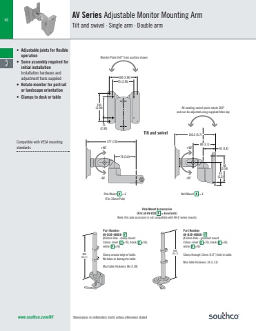 Dimensions in millimeters (inch) unless otherwise stated60www.southco.com/AVTilt and swivel• Adjustable joints for flexible operation• Some assembly required for initial installationInstallation hardware and adjustment tools supplied• Rotate monitor for portrait or landscape orientation• Clamps to desk or tableCompatible with VESA mounting standardsAV Series Adjustable Monitor Mounting ArmTilt and swivel · Single arm · Double arm 75 (2.95)100 (3.94)75(2.95)100(3.94)80 (3.1)45 (1.8)145.5 (5.7)76 (3.0)177 (7.0)+90˚-90˚+90˚-90˚83(3.3)90(3.54)All rotating swivel joints rotate 360°and can be adjusted using supplied Allen key Monitor Plate 360° from position shownPole Mount K = 6(Fits 30mm Pole)Pole Mount Accessories(Fits all AV-B30 K = 6 variants)Note: this pole accessory is not compatible with AV-D series mountsWall Mount K = 4Part Number:AV-B30-40XG6- FØ30mm Pole - grommet mountColour: silver ( F =70), black ( F =50),white ( F =76)Clamp through 12mm (1/2”) hole in table.Max table thickness 34 (1.33)400400 (15.7)(15.7)Part Number:AV-B30-40XC6- FØ30mm Pole - clamp mountColour: silver ( F =70), black ( F =50), white ( F =76)Clamp around edge of table.No holes or damage to table.Max table thickness 86 (3.38)