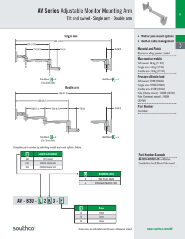 Dimensions in millimeters (inch) unless otherwise stated61www.southco.com/AV• Wall or pole mount options• Built-in cable managementMaterial and FinishAluminum alloy, powder coatedMax monitor weightTilt/swivel: 14 kg (31 lbf)Single arm: 14 kg (31 lbf)Double arm: 10 kg (22 lbf)Average ultimate loadTilt/swivel: 920N (206lbf)Single arm: 920N (206lbf)Double arm: 450N (101lbf)Pole (Clamp mount): 1100N (247lbf)Pole (Grommet mount): 1400N (314lbf)Part NumberSee tableComplete part number by selecting model and color options below.AV Series Adjustable Monitor Mounting ArmTilt and swivel · Single arm · Double arm Single armDouble armAV - B30 - L 2 K 3 - FF Color50 Black70 Silver76 WhiteK Mounting Style4 Wall (front) mount6 Pole mount (Ø30mm Pole)L Length & Function10K Tilt / swivel23A 220mm Single arm41D 400mm Double armPart Number ExampleAV-B30-41D263-70 = 400mm Double Arm for Ø30mm Pole mount220 (8.7) 76 (3)320 (12.6)365 (14.4)76 (3) 45 (1.8)45 (1.8)545 (21.5)220 (8.7)500 (19.7)180 (7.1)Pole Mount K = 6(Fits 30mm Pole)Pole Mount K = 6(Fits 30mm Pole)Wall Mount K = 4Wall Mount K = 4