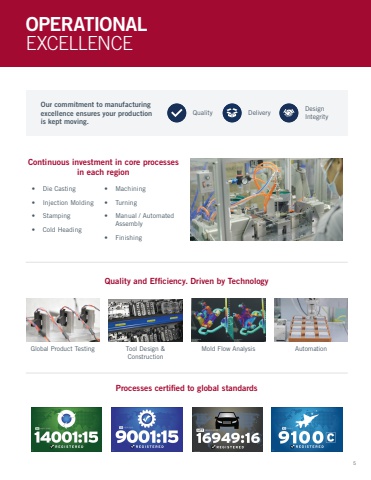Continuous investment in core processes in each regionQuality and Efficiency. Driven by TechnologyTool Design & Mold Flow Analysis AutomationConstructionGlobal Product Testing• Die Casting• Injection Molding• Stamping• Cold Heading• Machining • Turning• Manual / Automated Assembly• FinishingOur commitment to manufacturing excellence ensures your production is kept moving.Quality Delivery Design IntegrityOPERATIONAL EXCELLENCEProcesses certified to global standards 5