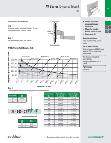 Dimensions in millimeters (inch) unless otherwise stated• Smooth operation enhances the user experience• Adjust the monitor without knobs or tools• Holds securelyMaterial and FinishSteel, Aluminum alloy, powder coatedPerformance DetailsCycle performance: 20,000 cycles within ± 20% of static torque specificationMax. dynamic working load: 100 N (22.5 lb)Average ultimate load: 1065 N(240 lb)Part NumberSee table63www.southco.com/AVAV Series Dynamic MountTilt 3 (6.6)4 (8.8)5 (11)6 (13.2)7 (15.4)8 (17.6)9 (19.8)10 (22.1)11 (24.3)12 (26.5)13 (28.7)14 (30.9)15 (33.1)25 (9.84)20 (7.87)15 (5.91) 10 (3.94)5 (1.97)0Display mounting surface to CG distance - cm (in)Display mass - kg (lbm)AV-D25 T-Series Model Selection GuideAV-D25-2T110AV-D25-2T95AV-D25-2T80AV-D25-2T65AV-D25-2T50AV-D25-2T35Step 1Determine monitor weight and distance (d) from mounting surface to center of gravity.Step 2Use chart below to select part number.Step 3Complete part number by selecting model and color options below.Monitor WeightCenter of GravitySpecification and Selection dTorque versionTForward Torque Nm (in-lb)Reverse Torque Nm (in-lb)35F 3.9 (35.0) 3.0 (26.7)50F 5.7 (50.0) 4.0 (35.7)65F 7.3 (65.0) 5.4 (47.5)80F 9.0 (80.0) 6.7 (59.4)95F 10.7 (95.0) 7.8 (68.9)110F 12.4 (110.0) 9.0 (79.8)35R 3.0 (26.7) 3.9 (35.0)50R 4.0 (35.7) 5.7 (50.0)65R 5.4 (47.5) 7.3 (65.0)80R 6.7 (59.4) 9.0 (80.0)95R 7.8 (68.9) 10.7 (95.0)110R 9.0 (79.8) 12.4 (110.0)AV - D25 - 2T V T - FF Color50 Black76 WhiteVESA Plate? VYes (blank)No 0