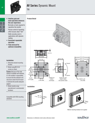 Dimensions in millimeters (inch) unless otherwise statedACTUAL SIZE64www.southco.com/AV90.2 (3.55)2.6 (.11)49 (1.93)38±.02(1.49±.008)38±.02(1.49±.008)31±.02(1.22±.008)31±.02(1.22±.008)4 X M5 X 0.810mmFull Thread44.6 (1.76)ForwardReverse49(1.93)19(.75)Display Tilt ±200range of motionfrom position shown100 (3.9)75 (2.95)115 (4.52)8 X Ø 5.2±.02(.20±.008)• Intuitive grab and move operation enhances the user experienceNo knobs or tools required to reposition the monitorPrecise control of operating effort ensures ideal “feel” Holds securely, even in applications with dynamic loading• Consistent repeatable operation• Fully enclosed for optimum cleanabilityAV Series Dynamic MountTiltProduct DetailInstallation1. Determine desired mounting location2. Attach using M5 X 0.8 screws as shownCaution: Because of the wide variety of available wall materials, it is the installer’s responsibility to ensure that the materials and structure to which the tilt mount is fastened will provide adequate support.3. Attach monitor using manufacturer’s recommended hardwareCompatible with VESA mounting standards4x Ø5.4 ±0.15(4x Ø0.213 ±.006)4x M5 x 0.8 screws(not provided)38 ±0.2(1.50 ±.008)38 ±0.2(1.50 ±.008)Snap-on wire retaining coverMonitor mounting hardware not suppliedInstallation