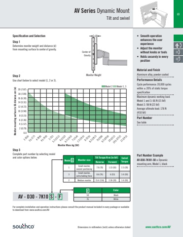 Dimensions in millimeters (inch) unless otherwise stated69www.southco.com/AV• Smooth operation enhances the user experience• Adjust the monitorwithout knobs or tools• Holds securely in every position Material and FinishAluminum alloy, powder coatedPerformance DetailsCycle performance: 20,000 cycles within ± 20% of static torque specificationMaximum dynamic working load: Model 1 and 3: 66 N (15 lbf)Model 2: 98 N (22 lbf)Average ultimate load: 178 N (450 lbf)Part NumberSee tablePart Number ExampleAV-D30-7K101-50 = Dynamic mounting arm, Model 1, blackAV - D30 - 7K10 S - FStep 1Determine monitor weight and distance (d) from mounting surface to center of gravity.Step 2Use chart below to select model (1, 2 or 3).Step 3Complete part number by selecting model and color options below.Monitor WeightCenter of GravitydAV Series Dynamic MountTilt and swivel Specification and SelectionF Color50 Black76 WhiteFor complete installation and operation instructions please consult the product manual included in every package or available to download from www.southco.com/AVMonitor Mass kg (lbf)Monitor mounting surface to CG distance cm (in)3 (6.6)3.5 (7.7)4 (8.8)4.5 (9.9)5 (11)5.5 (12.1)6 (13.2)6.5 (14.3)7 (15.4)7.5 (16.5)8 (17.6)8.5 (18.7)9 (19.8)9.5 (20.9)10 (22.1)10.5 (23.2)11 (24.3)20 (7.87)18 (7.09)16 (6.30)14 (5.51)12 (4.72)10 (3.94)8 (3.15)6 (2.36)4 (1.57)2 (0.79) 0.0 Model 2 Model 1, 3Model S Monitor size Tilt Torque Nm (inlbf) SwivelReverse Forward Torque1 Small monitor, easiest positioning 7.9 (70) 1.13 (10) 2.3 (20)3 Small monitor,extra holding force 8.6 (76) 6 (53) 3.4 (30)2 Medium monitor 15.4 (136) 2.26 (20) 3.4 (30)