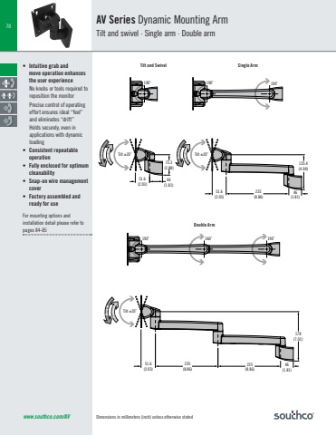 Dimensions in millimeters (inch) unless otherwise stated70www.southco.com/AV• Intuitive grab and move operation enhances the user experience No knobs or tools required to reposition the monitor Precise control of operating effort ensures ideal “feel” and eliminates “drift”Holds securely, even in applications with dynamic loading• Consistent repeatable operation• Fully enclosed for optimum cleanability• Snap-on wire management cover • Factory assembled and ready for useFor mounting options and installation detail please refer to pages 84-85AV Series Dynamic Mounting ArmTilt and swivel · Single arm · Double arm 51.6(2.03)225(8.86)225(8.86)46(1.81)178(7.01)Tilt ±20˚190˚ 360˚ 190˚190˚ 190˚ 190˚ReverseForward73.3(2.88)51.6(2.03)Tilt ±20˚ Tilt ±20˚46(1.81)125.4(4.94)46(1.81)225(8.86)51.6(2.03)ReverseForwardReverseForwardTilt and Swivel Single ArmDouble Arm