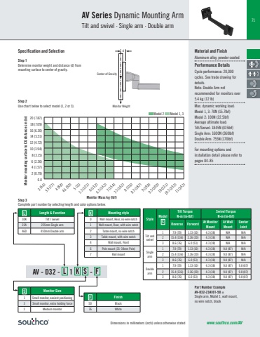 Dimensions in millimeters (inch) unless otherwise stated71www.southco.com/AVPart Number ExampleAV-D32-23A101-50 =Single arm, Model 1, wall mount, no wire notch, blackAV Series Dynamic Mounting ArmTilt and swivel · Single arm · Double arm Material and FinishAluminum alloy, powder coatedPerformance DetailsCycle performance: 20,000 cycles. See trade drawing for details.Note: Double Arm not recommended for monitors over 5.4 kg (12 lb)Max. dynamic working load: Model 1, 3: 70N (15.7lbf)Model 2: 100N (22.5lbf)Average ultimate load: Tilt/Swivel: 1845N (415lbf)Single Arm: 1600N (360lbf)Double Arm: 755N (170lbf)For mounting options and installation detail please refer to pages 84-85StyleModelSTilt TorqueNm (inlbf)Swivel TorqueNm (inlbf)Reverse Forward At Monitor MountAt Wall MountCenter JointTilt and swivel1 7.9 (70) 1.13 (10) 4.3 (38) N/A N/A2 15.4 (136) 2.26 (20) 4.3 (38) N/A N/A3 8.6 (76) 6.0 (53) 4.3 (38) N/A N/ASingle arm1 7.9 (70) 1.13 (10) 4.3 (38) 9.8 (87) N/A2 15.4 (136) 2.26 (20) 4.3 (38) 9.8 (87) N/A3 8.6 (76) 6.0 (53) 4.3 (38) 9.8 (87) N/ADouble arm1 7.9 (70) 1.13 (10) 4.3 (38) 9.8 (87) 9.8 (87)2 15.4 (136) 2.26 (20) 4.3 (38) 9.8 (87) 9.8 (87)3 8.6 (76) 6.0 (53) 4.3 (38) 9.8 (87) 9.8 (87)AV - D32 - L 1 K S - FK Mounting style0 Wall mount, Rear, no wire notch1 Wall mount, Rear, with wire notch2 Table mount, no wire notch3 Table mount, with wire notch4 Wall mount, Front6 Pole mount (35-38mm Pole)7 Rail mountS Monitor Size1 Small monitor, easiest positioning3 Small monitor, extra holding force2 Medium monitorF Finish50 Black76 WhiteL Length & Function10K Tilt / swivel23A 225mm Single arm46D 450mm Double armStep 2Use chart below to select model (1, 2 or 3).Step 1Determine monitor weight and distance (d) from mounting surface to center of gravity.Step 3Complete part number by selecting length and color options below.Specification and SelectionMonitor WeightCenter of GravitydMonitor Mass kg (lbf)Monitor mounting surface to CG distance cm (in)3 (6.6)3.5 (7.7)4 (8.8)4.5 (9.9)5 (11)5.5 (12.1)6 (13.2)6.5 (14.3)7 (15.4)7.5 (16.5)8 (17.6)8.5 (18.7)9 (19.8)9.5 (20.9)10 (22.1)10.5 (23.2)11 (24.3)20 (7.87)18 (7.09)16 (6.30)14 (5.51)12 (4.72)10 (3.94)8 (3.15)6 (2.36)4 (1.57)2 (0.79) 0.0 Model 2 Model 1, 3