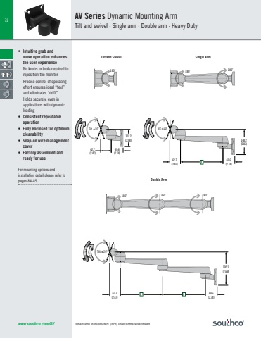 Dimensions in millimeters (inch) unless otherwise stated72www.southco.com/AV• Intuitive grab and move operation enhances the user experience No knobs or tools required to reposition the monitor Precise control of operating effort ensures ideal “feel” and eliminates “drift”Holds securely, even in applications with dynamic loading• Consistent repeatable operation• Fully enclosed for optimum cleanability• Snap-on wire management cover • Factory assembled and ready for useFor mounting options and installation detail please refer to pages 84-85AV Series Dynamic Mounting ArmTilt and swivel · Single arm · Double arm · Heavy DutyTilt and Swivel Single Arm180˚ 180˚ 180˚180˚ 360˚ 180˚Tilt ±20˚ Tilt ±20˚62.7(2.47)69.6(2.74)148.2(5.83)101.2(3.98)62.7(2.47)69.6(2.74)ReverseForwardReverseForwardL62.7(2.47)69.6(2.74)195.2(7.69)Tilt ±20˚ ReverseForwardL LDouble Arm
