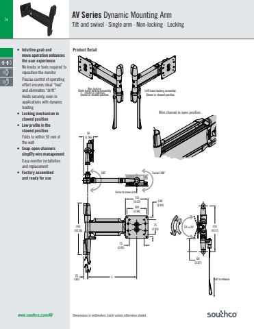Dimensions in millimeters (inch) unless otherwise stated74www.southco.com/AV• Intuitive grab and move operation enhances the user experienceNo knobs or tools required to reposition the monitorPrecise control of operating effort ensures ideal “feel” and eliminates “drift”Holds securely, even in applications with dynamic loading• Locking mechanism in stowed position• Low profile in the stowed positionFolds to within 50 mm of the wall• Snap-open channels simplify wire management Easy monitor installation and replacement• Factory assembled and ready for useAV Series Dynamic Mounting ArmTilt and swivel · Single arm · Non-locking · Locking Product DetailReverseForwardTilt ±200Swivel 180˚263(10.36)233(9.17)Pull to release68(2.67)100(3.94)100(3.94)115(4.53)Force to move arm75(2.95)75(2.95)21(.83)50(1.96)Left hand locking assemblyShown in stowed positionRight hand locking assemblyShown in stowed positionL180˚Wire channel in open position.Non lockingshown in position