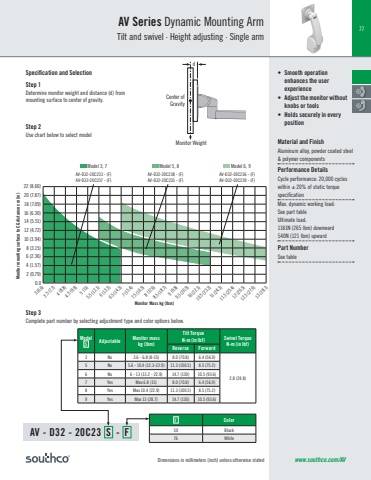 Dimensions in millimeters (inch) unless otherwise stated77www.southco.com/AVAV Series Dynamic Mounting ArmTilt and swivel · Height adjusting · Single arm AV - D32 - 20C23 S - FStep 1Determine monitor weight and distance (d) from mounting surface to center of gravity.Step 2Use chart below to select modelStep 3Complete part number by selecting adjustment type and color options below.Monitor WeightCenter of Gravityd• Smooth operation enhances the user experience• Adjust the monitor without knobs or tools• Holds securely in every position Material and FinishAluminum alloy, powder coated steel & polymer componentsPerformance Details Cycle performance: 20,000 cycles within ± 20% of static torque specificationMax. dynamic working load: See part tableUltimate load:1181N (265 lbm) downward540N (121 lbm) upwardPart NumberSee tableSpecification and SelectionF Color50 Black76 WhiteModel S Adjustable Monitor masskg (lbm)Tilt Torque Nm (in lbf) Swivel TorqueNm (in lbf) Reverse Forward3 No 3.6 - 6.8 (8-15) 8.0 (70.8) 6.4 (56.9)2.8 (24.8)5 No 5.6 - 10.4 (12.3-22.9) 11.3 (100.5) 8.5 (75.2)6 No 6 - 13 (13.2 - 22.9) 14.7 (130) 10.5 (93.6)7 Yes Max 6.8 (15) 8.0 (70.8) 6.4 (56.9)8 Yes Max 10.4 (22.9) 11.3 (100.5) 8.5 (75.2)9 Yes Max 13 (28.7) 14.7 (130) 10.5 (93.6) Model 6, 9 Monitor Mass kg (lbm)3 (6.6)3.5 (7.7)4 (8.8)4.5 (9.9)5 (11)5.5 (12.1)6 (13.2)6.5 (14.3)7 (15.4)7.5 (16.5)8 (17.6)8.5 (18.7)9 (9.8)9.5 (20.9)10 (22.1)10.5 (23.2)11 (24.3)11.5 (25.4)12 (26.5)12.5 (27.6)13 (28.7)22 (8.66)20 (7.87)18 (7.09)16 (6.30)14 (5.51)12 (4.72)10 (3.94)8 (3.15)6 (2.36)4 (1.57)2 (0.79) 0.0Monitor mounting surface to CG distance cm (in)AV-D32-20C233 - (F)AV-D32-20C237 - (F)AV-D32-20C238 - (F)AV-D32-20C235 - (F)AV-D32-20C236 - (F)AV-D32-20C239 - (F) Model 3, 7 Model 5, 8