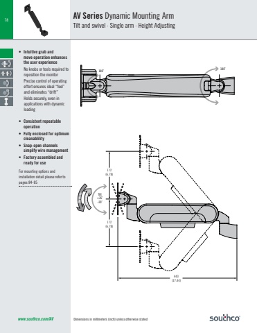 Dimensions in millimeters (inch) unless otherwise stated180˚ 180˚172(6.78)172(6.78)443(17.44)Tilt+35˚-20˚ ReverseForward78www.southco.com/AV• Intuitive grab and move operation enhances the user experience No knobs or tools required to reposition the monitor Precise control of operating effort ensures ideal “feel” and eliminates “drift”Holds securely, even in applications with dynamic loading• Consistent repeatable operation• Fully enclosed for optimum cleanablility• Snap-open channels simplify wire management• Factory assembled and ready for useFor mounting options and installation detail please refer to pages 84-85AV Series Dynamic Mounting ArmTilt and swivel · Single arm · Height Adjusting