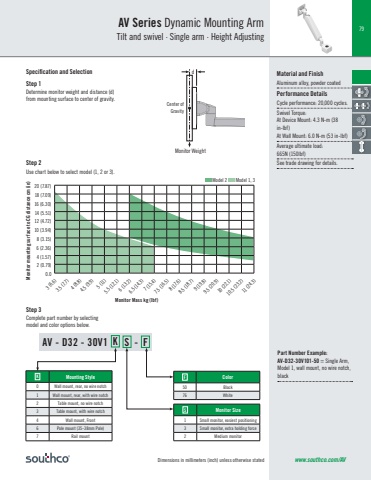 Dimensions in millimeters (inch) unless otherwise stated79www.southco.com/AVAV Series Dynamic Mounting ArmTilt and swivel · Single arm · Height AdjustingMaterial and FinishAluminum alloy, powder coatedPerformance DetailsCycle performance: 20,000 cycles. Swivel Torque: At Device Mount: 4.3 N-m (38 in-lbf)At Wall Mount: 6.0 N-m (53 in-lbf)Average ultimate load: 665N (150lbf)See trade drawing for details. AV - D32 - 30V1 K S - FK Mounting Style0 Wall mount, rear, no wire notch1 Wall mount, rear, with wire notch2 Table mount, no wire notch3 Table mount, with wire notch4 Wall mount, Front6 Pole mount (35-38mm Pole)7 Rail mountF Color50 Black76 WhiteS Monitor Size1 Small monitor, easiest positioning3 Small monitor, extra holding force2 Medium monitorStep 1Determine monitor weight and distance (d) from mounting surface to center of gravity.Step 3Complete part number by selecting model and color options below.Monitor WeightCenter of GravitySpecification and Selection dPart Number Example: AV-D32-30V101-50 = Single Arm, Model 1, wall mount, no wire notch, black Step 2Use chart below to select model (1, 2 or 3).Monitor Mass kg (lbf)Monitor mounting surface to CG distance cm (in)3 (6.6)3.5 (7.7)4 (8.8)4.5 (9.9)5 (11)5.5 (12.1)6 (13.2)6.5 (14.3)7 (15.4)7.5 (16.5)8 (17.6)8.5 (18.7)9 (19.8)9.5 (20.9)10 (22.1)10.5 (23.2)11 (24.3)20 (7.87)18 (7.09)16 (6.30)14 (5.51)12 (4.72)10 (3.94)8 (3.15)6 (2.36)4 (1.57)2 (0.79) 0.0 Model 2 Model 1, 3