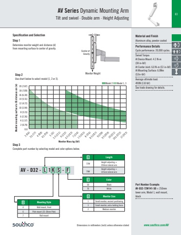 Dimensions in millimeters (inch) unless otherwise stated83www.southco.com/AVAV Series Dynamic Mounting ArmTilt and swivel · Double arm · Height Adjusting AV - D32 - L 1 K S - FK Mounting Style4 Wall mount, Front6 Pole mount (35-38mm Pole)7 Rail mountF Color50 Black76 WhiteL Length72W Height adjusting +250mm lateral arm79WHeight adjusting +325mm lateral armS Monitor Size1 Small monitor, easiest positioning3 Small monitor, extra holding force2 Medium monitorStep 1Determine monitor weight and distance (d) from mounting surface to center of gravity.Step 3Complete part number by selecting model and color options below.Monitor WeightCenter of GravitySpecification and Selection d Material and FinishAluminum alloy, powder coatedPerformance DetailsCycle performance: 20,000 cycles. Swivel Torque: At Device Mount: 4.3 N-m(38 in-lbf)At Center Joint: 6.0 N-m (53 in-lbf)At Mounting Surface: 6.0Nm(53in-lbf)Average ultimate load: 490N (110 lbf)See trade drawing for details.Step 2Use chart below to select model (1, 2 or 3).Monitor Mass kg (lbf)Monitor mounting surface to CG distance cm (in)3 (6.6)3.5 (7.7)4 (8.8)4.5 (9.9)5 (11)5.5 (12.1)6 (13.2)6.5 (14.3)7 (15.4)7.5 (16.5)8 (17.6)8.5 (18.7)9 (19.8)9.5 (20.9)10 (22.1)10.5 (23.2)11 (24.3)20 (7.87)18 (7.09)16 (6.30)14 (5.51)12 (4.72)10 (3.94)8 (3.15)6 (2.36)4 (1.57)2 (0.79) 0.0 Model 2 Model 1, 3Part Number Example: AV-D32-72W141-50 = 250mm lower arm, Model 1, wall mount, black